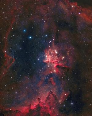 At the very center of the Heart Nebula (IC 1805) lies Melotte 15, a young open star cluster whose powerful winds and radiation sculpt the glowing clouds around it into intricate shapes. Towering pillars of dust and gas rise like cosmic sculptures, their crimson edges illuminated by the newborn stars within. Roughly 7,500 light-years away in the constellation Cassiopeia, this region is both delicate and fierce — a stellar nursery where creation unfolds, carving beauty from chaos. Here, the universe beats with a heart of fire, endlessly renewing itself among the stars.