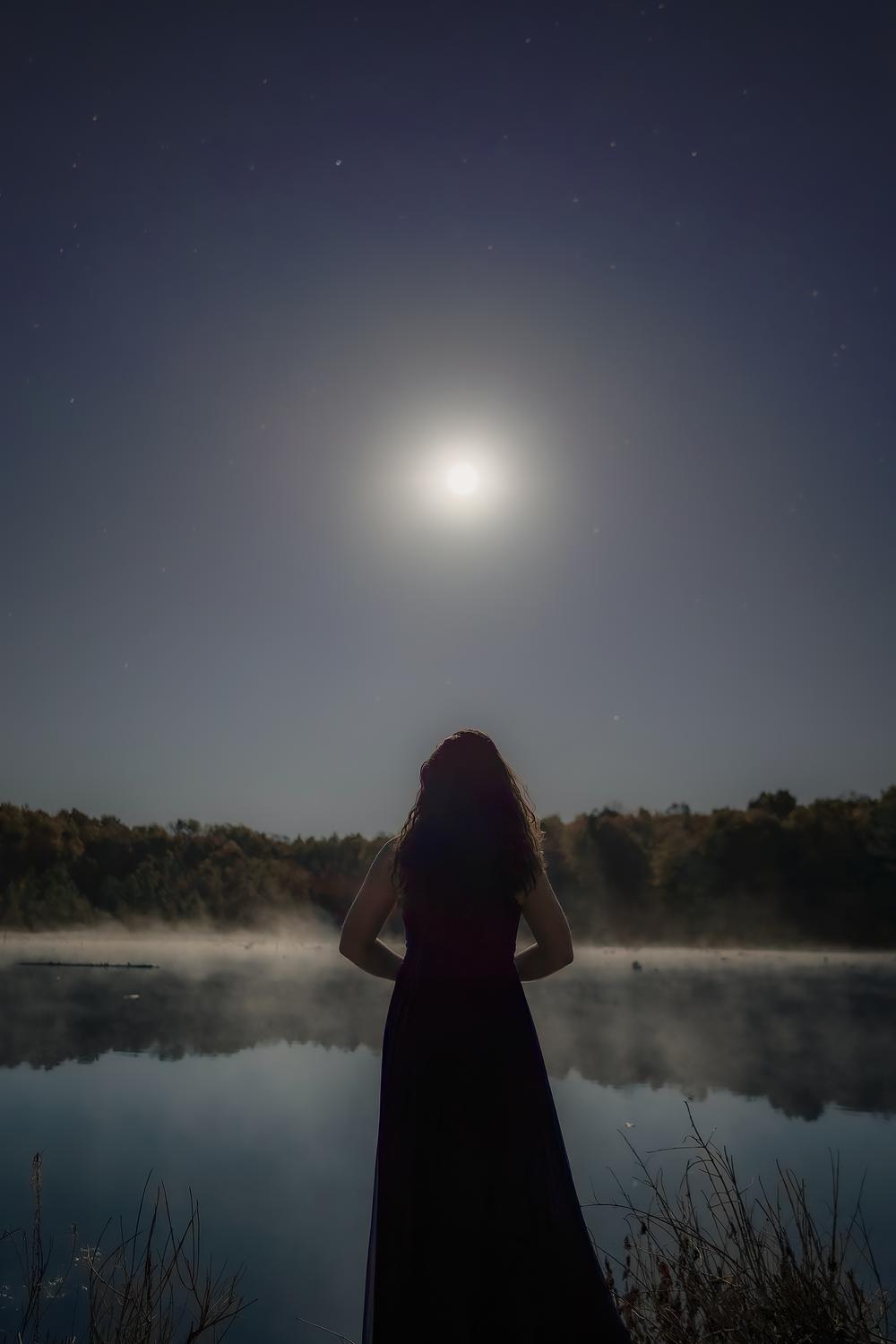 Bathed in moonlight, a lone figure stands in stillness along the misty shoreline of a quiet Upstate New York. This moonrise portrait captures the soft mystery of nightfall, where nature, reflection, and solitude meet beneath the stars.