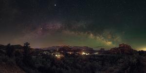 The Milky Way stretches across the night sky in a perfect arc above Sedona, Arizona glowing with subtle airglow and starlight. This desert nightscape captures the mystical harmony between red rock formations and the cosmos that makes Sedona an iconic destination for stargazing and spiritual seekers alike.