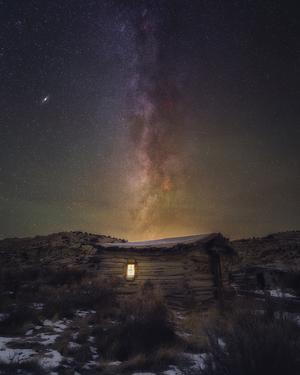 A single lantern glows from within the historic Wolfe Ranch cabin under the sweeping core of the Milky Way in Arches National Park, Utah. This quiet desert scene captures the intersection of pioneer history and the eternal sky.