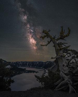A twisted ancient pine clings to the rim of Crater Lake, silhouetted against the brilliant core of the Milky Way in the night sky. This scene from Oregon’s iconic national park captures a sense of stillness and time stretching across centuries.
