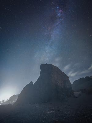 A solitary sea stack rises like a watchful guardian under the Milky Way along Gold Beach, Oregon. The glow of the galaxy contrasts with the cool coastal mist, creating a dreamlike moment on the Oregon coast.