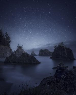 Under a dome of stars, the sea stacks of Secret Beach stand like silent sentinels on the southern Oregon coast. Soft waves and scattered starlight meet in this secluded cove near Brookings, capturing the deep stillness of night by the Pacific.