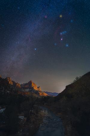 The Watchman glows in the last light of day as Orion rises above Zion National Park, Utah. Captured from the iconic bridge viewpoint, this image blends celestial majesty with the towering sandstone sentinels of the desert southwest.