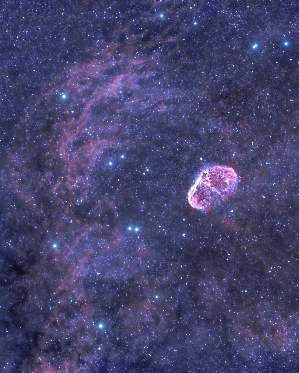 Drifting in the constellation Cygnus, the Crescent Nebula (NGC 6888) glows like a delicate cosmic shell — the product of a massive star shedding its outer layers in a fierce stellar wind. About 5,000 light-years from Earth, this nebula is a luminous testament to both the power and fragility of stars in their final stages. The soft violet and rose-hued filaments weave through the surrounding starlight, creating a vision that is at once turbulent and serene — a celestial reminder that endings in the universe often give rise to new beginnings.